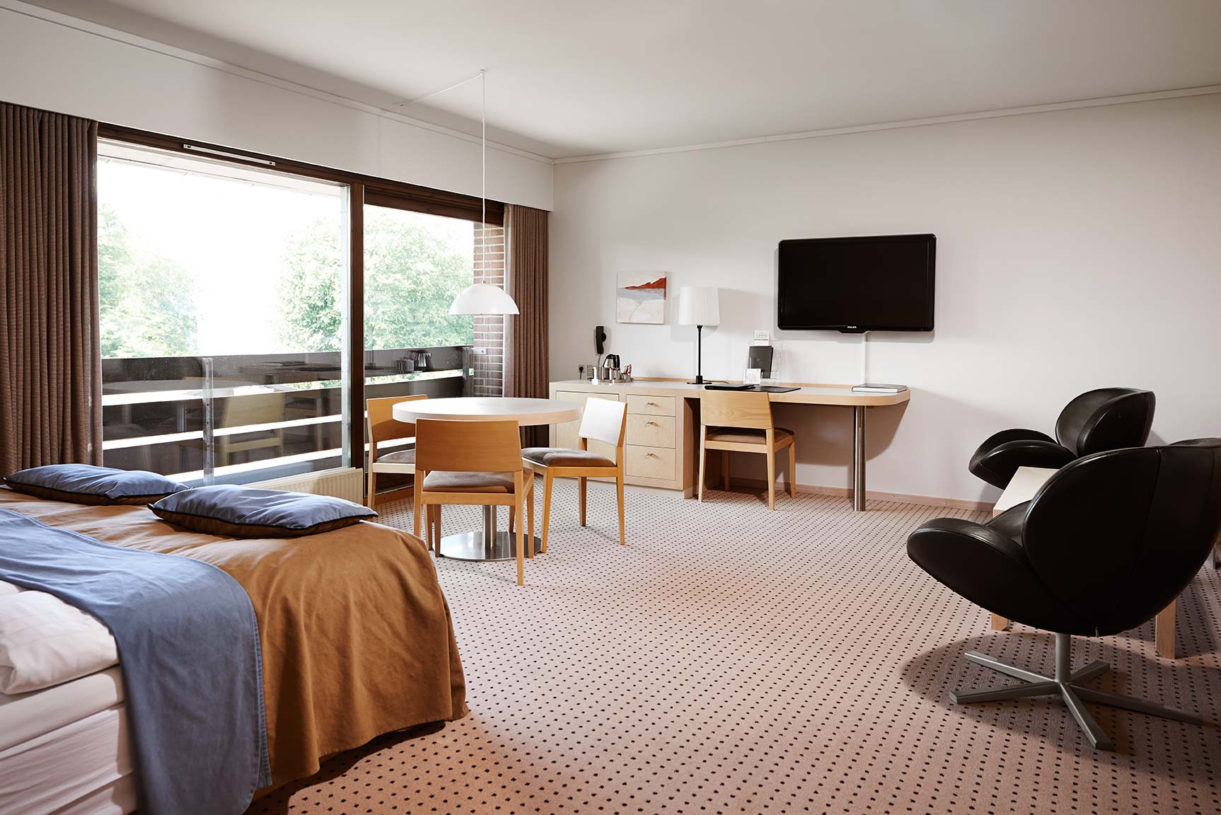 Vi råder over nogle særdeles luksuriøse, lyse og meget rummelige juniorsuiter. Den ene har direkte panoramaudsigt over Vejle Fjord, to balkoner og stort badeværelse med bruser og spa. Den anden har skrå udsigt til Vejle Fjord og Munkebjergskoven, et møde/spisebord samt et stort luksuriøst badeværelse.