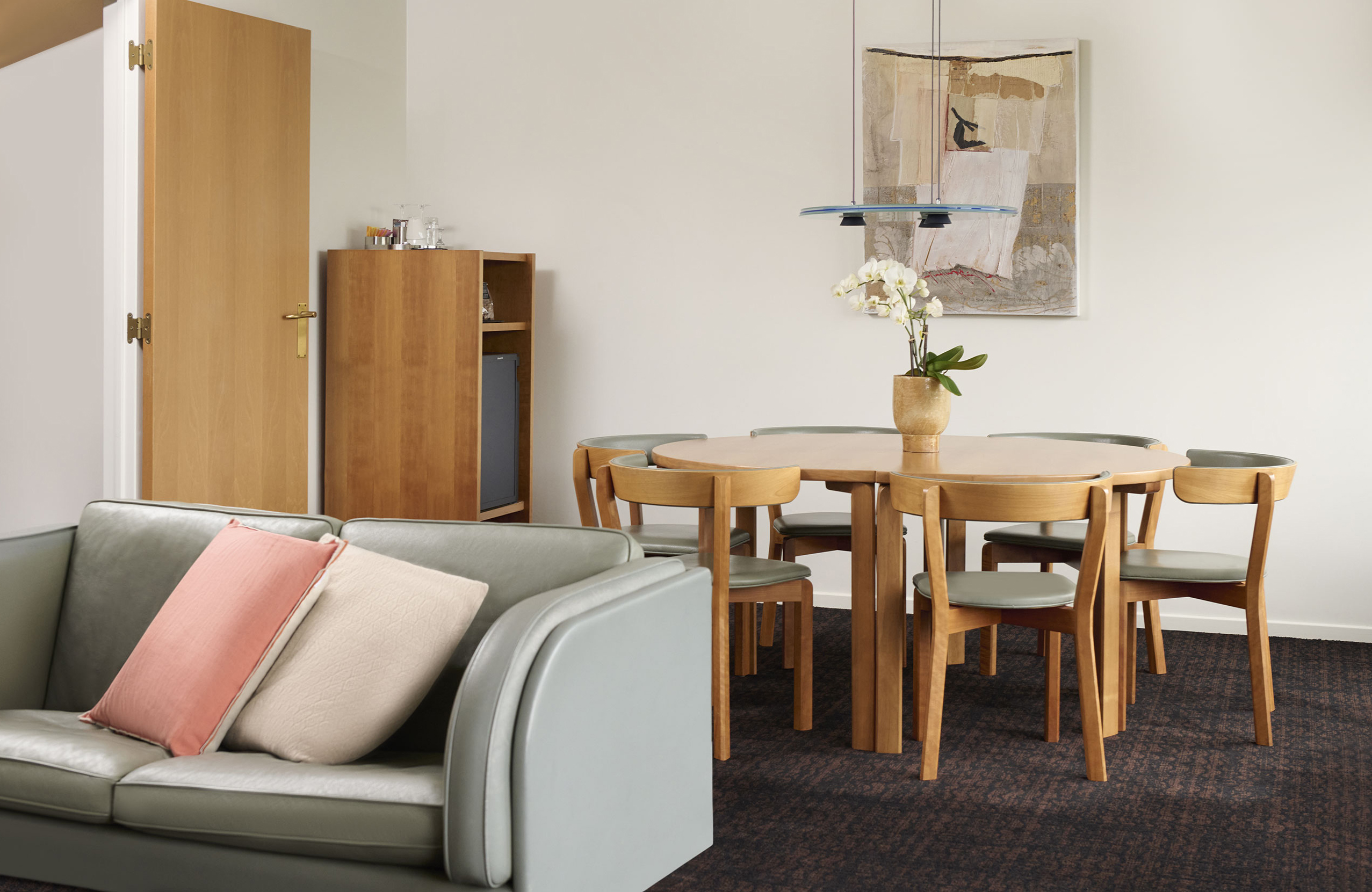Spiseplads, sofaområde og skrivebord